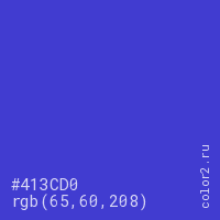Цвет #413CD0 в цветовой модели RGB обозначается тремя октетами (65, 60, 208) в десятичном формате и #413CD0 в шестнадцатиричном (hex) формате, которые являются интенсивностью красного 65 (hex 41), интенсивность зелёного 60 (hex 3C) и интенсивность синего 208 (hex D0).
