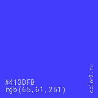 Цвет #413DFB в цветовой модели RGB обозначается тремя октетами (65, 61, 251) в десятичном формате и #413DFB в шестнадцатиричном (hex) формате, которые являются интенсивностью красного 65 (hex 41), интенсивность зелёного 61 (hex 3D) и интенсивность синего 251 (hex FB).