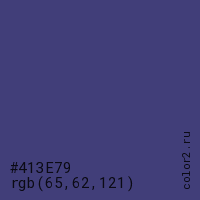 Цвет #413E79 в цветовой модели RGB обозначается тремя октетами (65, 62, 121) в десятичном формате и #413E79 в шестнадцатиричном (hex) формате, которые являются интенсивностью красного 65 (hex 41), интенсивность зелёного 62 (hex 3E) и интенсивность синего 121 (hex 79).