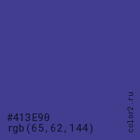 Цвет #413E90 в цветовой модели RGB обозначается тремя октетами (65, 62, 144) в десятичном формате и #413E90 в шестнадцатиричном (hex) формате, которые являются интенсивностью красного 65 (hex 41), интенсивность зелёного 62 (hex 3E) и интенсивность синего 144 (hex 90).
