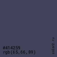 Цвет #414259 в цветовой модели RGB обозначается тремя октетами (65, 66, 89) в десятичном формате и #414259 в шестнадцатиричном (hex) формате, которые являются интенсивностью красного 65 (hex 41), интенсивность зелёного 66 (hex 42) и интенсивность синего 89 (hex 59).
