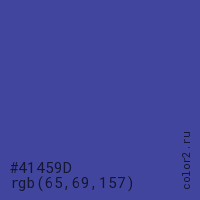 Цвет #41459D в цветовой модели RGB обозначается тремя октетами (65, 69, 157) в десятичном формате и #41459D в шестнадцатиричном (hex) формате, которые являются интенсивностью красного 65 (hex 41), интенсивность зелёного 69 (hex 45) и интенсивность синего 157 (hex 9D).