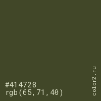 Цвет #414728 в цветовой модели RGB обозначается тремя октетами (65, 71, 40) в десятичном формате и #414728 в шестнадцатиричном (hex) формате, которые являются интенсивностью красного 65 (hex 41), интенсивность зелёного 71 (hex 47) и интенсивность синего 40 (hex 28).