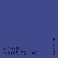 Цвет #41488C в цветовой модели RGB обозначается тремя октетами (65, 72, 140) в десятичном формате и #41488C в шестнадцатиричном (hex) формате, которые являются интенсивностью красного 65 (hex 41), интенсивность зелёного 72 (hex 48) и интенсивность синего 140 (hex 8C).
