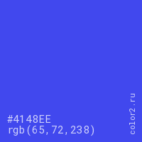 Цвет #4148EE в цветовой модели RGB обозначается тремя октетами (65, 72, 238) в десятичном формате и #4148EE в шестнадцатиричном (hex) формате, которые являются интенсивностью красного 65 (hex 41), интенсивность зелёного 72 (hex 48) и интенсивность синего 238 (hex EE).
