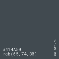 Цвет #414A50 в цветовой модели RGB обозначается тремя октетами (65, 74, 80) в десятичном формате и #414A50 в шестнадцатиричном (hex) формате, которые являются интенсивностью красного 65 (hex 41), интенсивность зелёного 74 (hex 4A) и интенсивность синего 80 (hex 50).