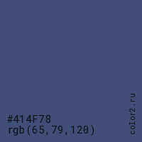 Цвет #414F78 в цветовой модели RGB обозначается тремя октетами (65, 79, 120) в десятичном формате и #414F78 в шестнадцатиричном (hex) формате, которые являются интенсивностью красного 65 (hex 41), интенсивность зелёного 79 (hex 4F) и интенсивность синего 120 (hex 78).