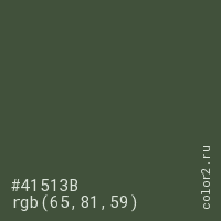 Цвет #41513B в цветовой модели RGB обозначается тремя октетами (65, 81, 59) в десятичном формате и #41513B в шестнадцатиричном (hex) формате, которые являются интенсивностью красного 65 (hex 41), интенсивность зелёного 81 (hex 51) и интенсивность синего 59 (hex 3B).
