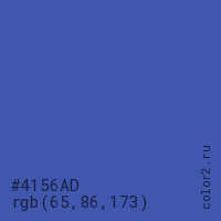 Цвет #4156AD в цветовой модели RGB обозначается тремя октетами (65, 86, 173) в десятичном формате и #4156AD в шестнадцатиричном (hex) формате, которые являются интенсивностью красного 65 (hex 41), интенсивность зелёного 86 (hex 56) и интенсивность синего 173 (hex AD).