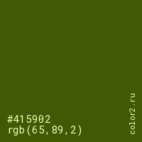 Цвет #415902 в цветовой модели RGB обозначается тремя октетами (65, 89, 2) в десятичном формате и #415902 в шестнадцатиричном (hex) формате, которые являются интенсивностью красного 65 (hex 41), интенсивность зелёного 89 (hex 59) и интенсивность синего 2 (hex 02).