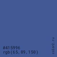 Цвет #415996 в цветовой модели RGB обозначается тремя октетами (65, 89, 150) в десятичном формате и #415996 в шестнадцатиричном (hex) формате, которые являются интенсивностью красного 65 (hex 41), интенсивность зелёного 89 (hex 59) и интенсивность синего 150 (hex 96).