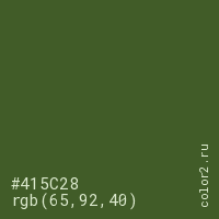 Цвет #415C28 в цветовой модели RGB обозначается тремя октетами (65, 92, 40) в десятичном формате и #415C28 в шестнадцатиричном (hex) формате, которые являются интенсивностью красного 65 (hex 41), интенсивность зелёного 92 (hex 5C) и интенсивность синего 40 (hex 28).
