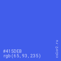Цвет #415DEB в цветовой модели RGB обозначается тремя октетами (65, 93, 235) в десятичном формате и #415DEB в шестнадцатиричном (hex) формате, которые являются интенсивностью красного 65 (hex 41), интенсивность зелёного 93 (hex 5D) и интенсивность синего 235 (hex EB).
