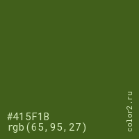 Цвет #415F1B в цветовой модели RGB обозначается тремя октетами (65, 95, 27) в десятичном формате и #415F1B в шестнадцатиричном (hex) формате, которые являются интенсивностью красного 65 (hex 41), интенсивность зелёного 95 (hex 5F) и интенсивность синего 27 (hex 1B).