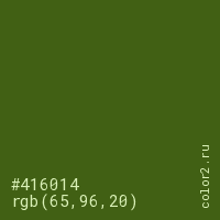 Цвет #416014 в цветовой модели RGB обозначается тремя октетами (65, 96, 20) в десятичном формате и #416014 в шестнадцатиричном (hex) формате, которые являются интенсивностью красного 65 (hex 41), интенсивность зелёного 96 (hex 60) и интенсивность синего 20 (hex 14).