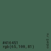 Цвет #416451 в цветовой модели RGB обозначается тремя октетами (65, 100, 81) в десятичном формате и #416451 в шестнадцатиричном (hex) формате, которые являются интенсивностью красного 65 (hex 41), интенсивность зелёного 100 (hex 64) и интенсивность синего 81 (hex 51).