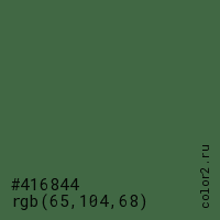 Цвет #416844 в цветовой модели RGB обозначается тремя октетами (65, 104, 68) в десятичном формате и #416844 в шестнадцатиричном (hex) формате, которые являются интенсивностью красного 65 (hex 41), интенсивность зелёного 104 (hex 68) и интенсивность синего 68 (hex 44).