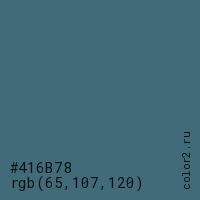 Цвет #416B78 в цветовой модели RGB обозначается тремя октетами (65, 107, 120) в десятичном формате и #416B78 в шестнадцатиричном (hex) формате, которые являются интенсивностью красного 65 (hex 41), интенсивность зелёного 107 (hex 6B) и интенсивность синего 120 (hex 78).