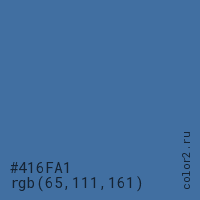 Цвет #416FA1 в цветовой модели RGB обозначается тремя октетами (65, 111, 161) в десятичном формате и #416FA1 в шестнадцатиричном (hex) формате, которые являются интенсивностью красного 65 (hex 41), интенсивность зелёного 111 (hex 6F) и интенсивность синего 161 (hex A1).