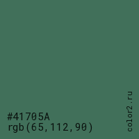 Цвет #41705A в цветовой модели RGB обозначается тремя октетами (65, 112, 90) в десятичном формате и #41705A в шестнадцатиричном (hex) формате, которые являются интенсивностью красного 65 (hex 41), интенсивность зелёного 112 (hex 70) и интенсивность синего 90 (hex 5A).