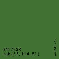 Цвет #417233 в цветовой модели RGB обозначается тремя октетами (65, 114, 51) в десятичном формате и #417233 в шестнадцатиричном (hex) формате, которые являются интенсивностью красного 65 (hex 41), интенсивность зелёного 114 (hex 72) и интенсивность синего 51 (hex 33).