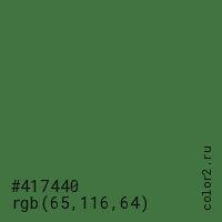 Цвет #417440 в цветовой модели RGB обозначается тремя октетами (65, 116, 64) в десятичном формате и #417440 в шестнадцатиричном (hex) формате, которые являются интенсивностью красного 65 (hex 41), интенсивность зелёного 116 (hex 74) и интенсивность синего 64 (hex 40).