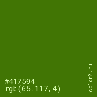 Цвет #417504 в цветовой модели RGB обозначается тремя октетами (65, 117, 4) в десятичном формате и #417504 в шестнадцатиричном (hex) формате, которые являются интенсивностью красного 65 (hex 41), интенсивность зелёного 117 (hex 75) и интенсивность синего 4 (hex 04).