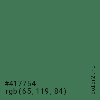 Цвет #417754 в цветовой модели RGB обозначается тремя октетами (65, 119, 84) в десятичном формате и #417754 в шестнадцатиричном (hex) формате, которые являются интенсивностью красного 65 (hex 41), интенсивность зелёного 119 (hex 77) и интенсивность синего 84 (hex 54).