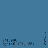 Цвет #41799C в цветовой модели RGB обозначается тремя октетами (65, 121, 156) в десятичном формате и #41799C в шестнадцатиричном (hex) формате, которые являются интенсивностью красного 65 (hex 41), интенсивность зелёного 121 (hex 79) и интенсивность синего 156 (hex 9C).
