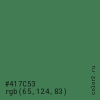 Цвет #417C53 в цветовой модели RGB обозначается тремя октетами (65, 124, 83) в десятичном формате и #417C53 в шестнадцатиричном (hex) формате, которые являются интенсивностью красного 65 (hex 41), интенсивность зелёного 124 (hex 7C) и интенсивность синего 83 (hex 53).
