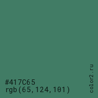 Цвет #417C65 в цветовой модели RGB обозначается тремя октетами (65, 124, 101) в десятичном формате и #417C65 в шестнадцатиричном (hex) формате, которые являются интенсивностью красного 65 (hex 41), интенсивность зелёного 124 (hex 7C) и интенсивность синего 101 (hex 65).