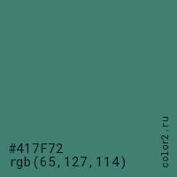 Цвет #417F72 в цветовой модели RGB обозначается тремя октетами (65, 127, 114) в десятичном формате и #417F72 в шестнадцатиричном (hex) формате, которые являются интенсивностью красного 65 (hex 41), интенсивность зелёного 127 (hex 7F) и интенсивность синего 114 (hex 72).