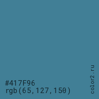 Цвет #417F96 в цветовой модели RGB обозначается тремя октетами (65, 127, 150) в десятичном формате и #417F96 в шестнадцатиричном (hex) формате, которые являются интенсивностью красного 65 (hex 41), интенсивность зелёного 127 (hex 7F) и интенсивность синего 150 (hex 96).