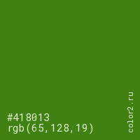 Цвет #418013 в цветовой модели RGB обозначается тремя октетами (65, 128, 19) в десятичном формате и #418013 в шестнадцатиричном (hex) формате, которые являются интенсивностью красного 65 (hex 41), интенсивность зелёного 128 (hex 80) и интенсивность синего 19 (hex 13).