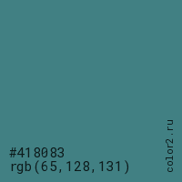 Цвет #418083 в цветовой модели RGB обозначается тремя октетами (65, 128, 131) в десятичном формате и #418083 в шестнадцатиричном (hex) формате, которые являются интенсивностью красного 65 (hex 41), интенсивность зелёного 128 (hex 80) и интенсивность синего 131 (hex 83).
