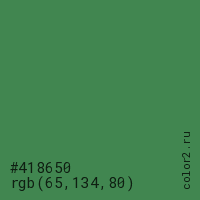 Цвет #418650 в цветовой модели RGB обозначается тремя октетами (65, 134, 80) в десятичном формате и #418650 в шестнадцатиричном (hex) формате, которые являются интенсивностью красного 65 (hex 41), интенсивность зелёного 134 (hex 86) и интенсивность синего 80 (hex 50).