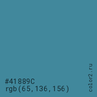 Цвет #41889C в цветовой модели RGB обозначается тремя октетами (65, 136, 156) в десятичном формате и #41889C в шестнадцатиричном (hex) формате, которые являются интенсивностью красного 65 (hex 41), интенсивность зелёного 136 (hex 88) и интенсивность синего 156 (hex 9C).