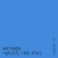 Цвет #418AD8 в цветовой модели RGB обозначается тремя октетами (65, 138, 216) в десятичном формате и #418AD8 в шестнадцатиричном (hex) формате, которые являются интенсивностью красного 65 (hex 41), интенсивность зелёного 138 (hex 8A) и интенсивность синего 216 (hex D8).
