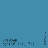 Цвет #418DAB в цветовой модели RGB обозначается тремя октетами (65, 141, 171) в десятичном формате и #418DAB в шестнадцатиричном (hex) формате, которые являются интенсивностью красного 65 (hex 41), интенсивность зелёного 141 (hex 8D) и интенсивность синего 171 (hex AB).
