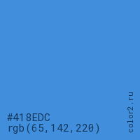 Цвет #418EDC в цветовой модели RGB обозначается тремя октетами (65, 142, 220) в десятичном формате и #418EDC в шестнадцатиричном (hex) формате, которые являются интенсивностью красного 65 (hex 41), интенсивность зелёного 142 (hex 8E) и интенсивность синего 220 (hex DC).