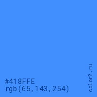 Цвет #418FFE в цветовой модели RGB обозначается тремя октетами (65, 143, 254) в десятичном формате и #418FFE в шестнадцатиричном (hex) формате, которые являются интенсивностью красного 65 (hex 41), интенсивность зелёного 143 (hex 8F) и интенсивность синего 254 (hex FE).