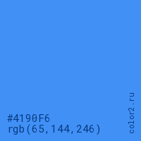 Цвет #4190F6 в цветовой модели RGB обозначается тремя октетами (65, 144, 246) в десятичном формате и #4190F6 в шестнадцатиричном (hex) формате, которые являются интенсивностью красного 65 (hex 41), интенсивность зелёного 144 (hex 90) и интенсивность синего 246 (hex F6).