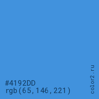 Цвет #4192DD в цветовой модели RGB обозначается тремя октетами (65, 146, 221) в десятичном формате и #4192DD в шестнадцатиричном (hex) формате, которые являются интенсивностью красного 65 (hex 41), интенсивность зелёного 146 (hex 92) и интенсивность синего 221 (hex DD).
