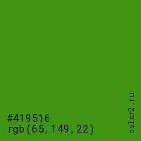 Цвет #419516 в цветовой модели RGB обозначается тремя октетами (65, 149, 22) в десятичном формате и #419516 в шестнадцатиричном (hex) формате, которые являются интенсивностью красного 65 (hex 41), интенсивность зелёного 149 (hex 95) и интенсивность синего 22 (hex 16).