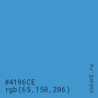 Цвет #4196CE в цветовой модели RGB обозначается тремя октетами (65, 150, 206) в десятичном формате и #4196CE в шестнадцатиричном (hex) формате, которые являются интенсивностью красного 65 (hex 41), интенсивность зелёного 150 (hex 96) и интенсивность синего 206 (hex CE).