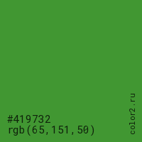 Цвет #419732 в цветовой модели RGB обозначается тремя октетами (65, 151, 50) в десятичном формате и #419732 в шестнадцатиричном (hex) формате, которые являются интенсивностью красного 65 (hex 41), интенсивность зелёного 151 (hex 97) и интенсивность синего 50 (hex 32).