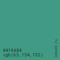 Цвет #419A84 в цветовой модели RGB обозначается тремя октетами (65, 154, 132) в десятичном формате и #419A84 в шестнадцатиричном (hex) формате, которые являются интенсивностью красного 65 (hex 41), интенсивность зелёного 154 (hex 9A) и интенсивность синего 132 (hex 84).