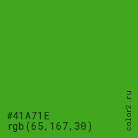 Цвет #41A71E в цветовой модели RGB обозначается тремя октетами (65, 167, 30) в десятичном формате и #41A71E в шестнадцатиричном (hex) формате, которые являются интенсивностью красного 65 (hex 41), интенсивность зелёного 167 (hex A7) и интенсивность синего 30 (hex 1E).