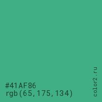 Цвет #41AF86 в цветовой модели RGB обозначается тремя октетами (65, 175, 134) в десятичном формате и #41AF86 в шестнадцатиричном (hex) формате, которые являются интенсивностью красного 65 (hex 41), интенсивность зелёного 175 (hex AF) и интенсивность синего 134 (hex 86).