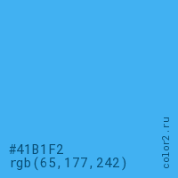 Цвет #41B1F2 в цветовой модели RGB обозначается тремя октетами (65, 177, 242) в десятичном формате и #41B1F2 в шестнадцатиричном (hex) формате, которые являются интенсивностью красного 65 (hex 41), интенсивность зелёного 177 (hex B1) и интенсивность синего 242 (hex F2).